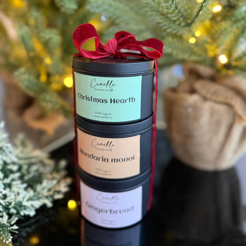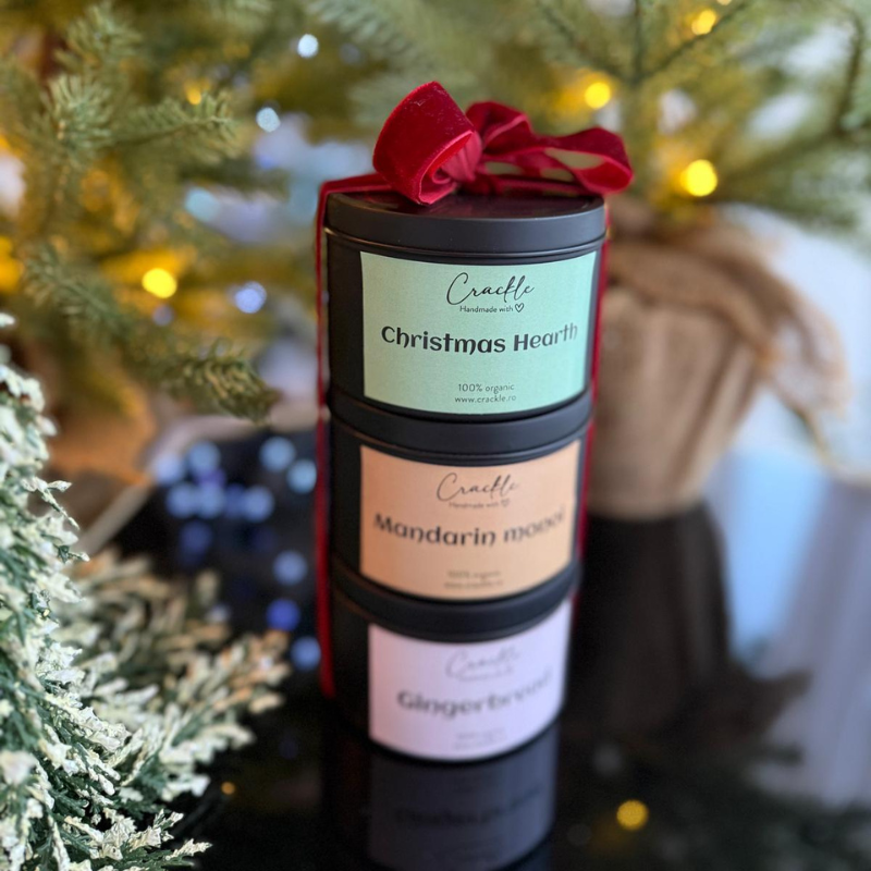 Setul conține trei lumânări de 200 ml, fiecare cu fitilul acela de foc care trosnește ușor și transformă orice cameră într-un colț de sărbătoare: